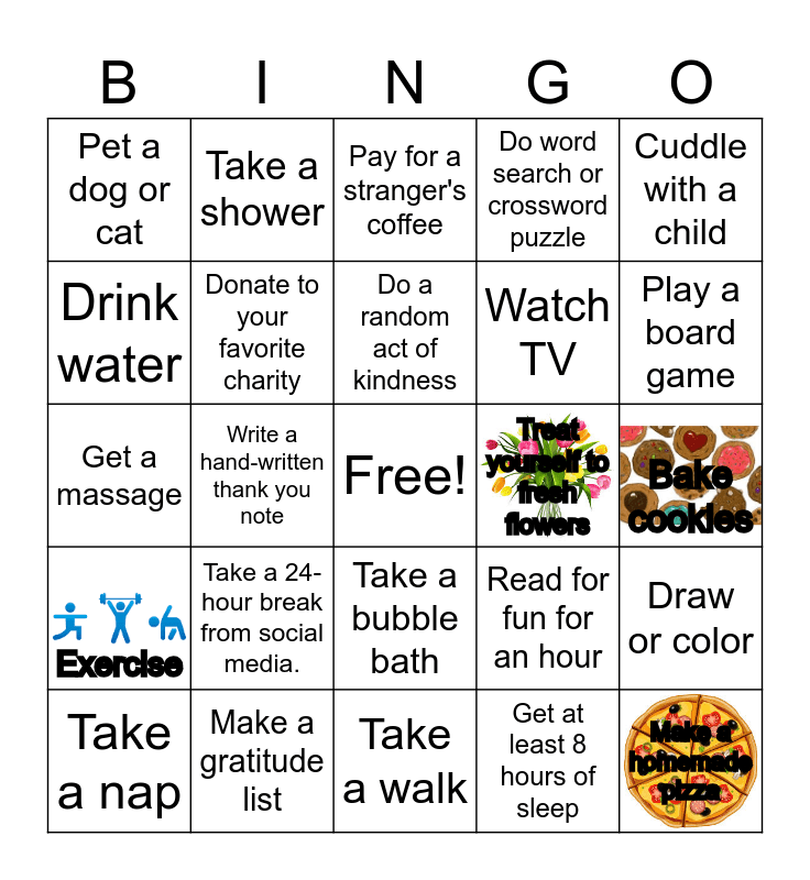 This bingo card has 4 images, a free space and 29 words: Take a nap, Give yourself a facial, Write a hand-written thank you note, Turn your phone off for an hour, Pet a dog or cat, Pay for a stranger's coffee, Donate to your favorite charity, Take a 24-hour break from social media., Treat yourself to fresh flowers, Make a gratitude list, Bake cookies, Make a homemade pizza, Take a walk, Get at least 8 hours of sleep, Play a board game, Burn a candle or diffuse oil, Take a bubble bath, Exercise, Cuddle with a child, Get a massage, Read for fun for an hour, Eat a healthy snack, Watch TV, Drink water, Do word search or crossword puzzle, Take a shower, Draw or color, Do a random act of kindness and Practice deep breathing.