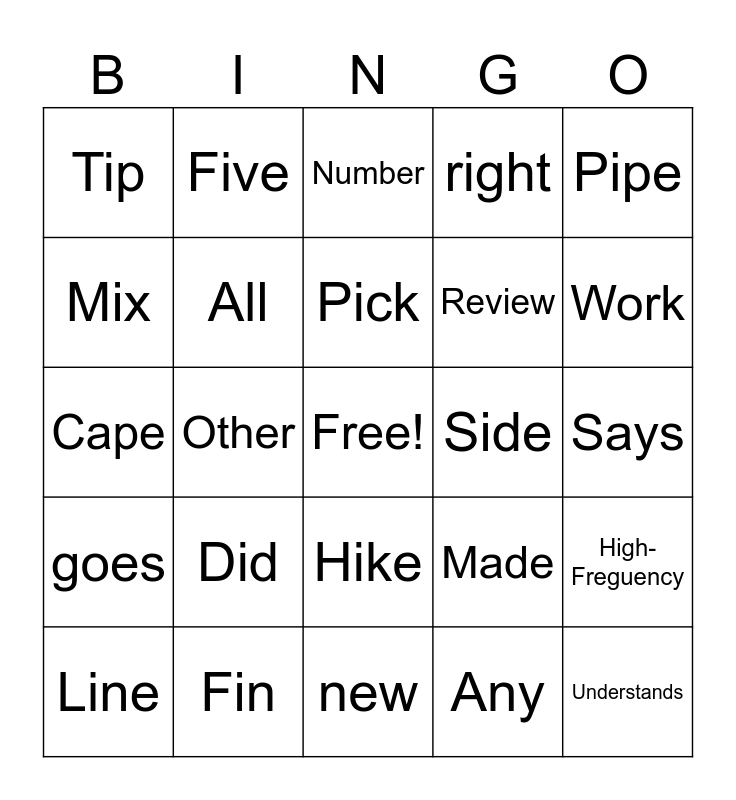 This bingo card has a free space and 24 words: Did, Fin, Pick, Line, Pipe, Tip, Mix, Five, Side, Hike, Review, Cape, Made, High-Freguency, All, Any, Says, Number, Work, Other, Understands, goes, right and new.