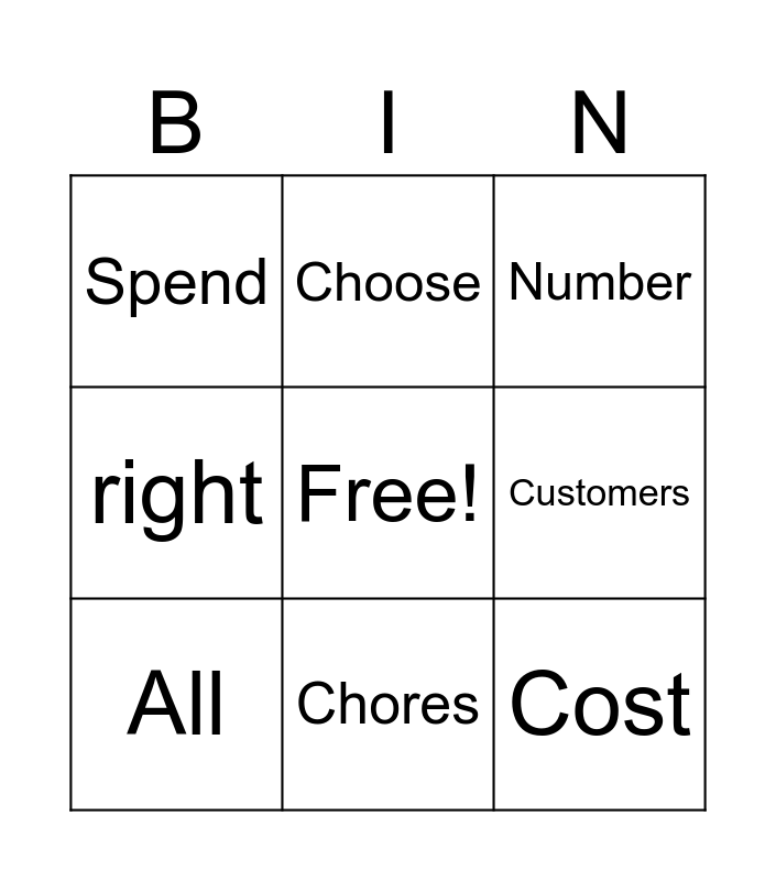 This bingo card has a free space and 24 words: Check, Jobs, Chores, Tools, Cost, Spend, Customers, Choose, Side, Hike, Review, Cape, Made, High-Freguency, All, Any, Says, Number, Work, Other, Understands, goes, right and new.