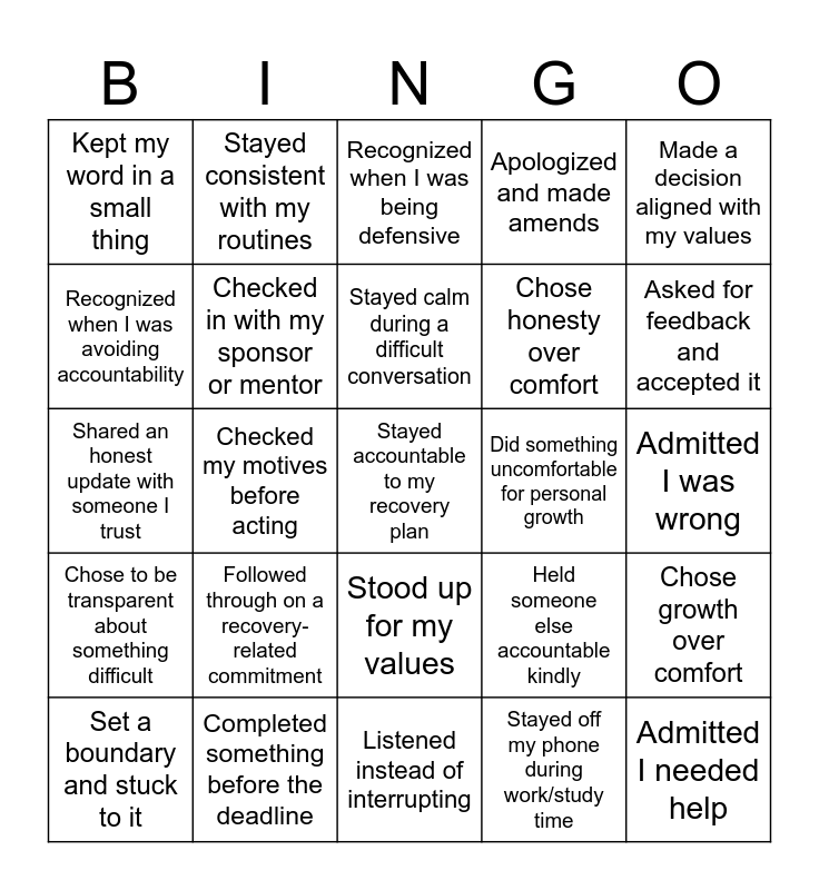 This bingo card has 53 words: Free!, Stayed accountable to my recovery plan, Reflected on a missed goal and tried again, Stayed off my phone during work/study time, Followed through on a recovery-related commitment, Made progress on a personal goal, Stayed consistent with my routines, Took ownership of my time management, Recognized when I was avoiding accountability, Balanced self-care with responsibility, Checked in with my sponsor or mentor, Followed through on something even when I didn’t feel like it, Chose growth over comfort, Held someone else accountable kindly, Refused to make excuses, Set a boundary and stuck to it, Stayed calm during a difficult conversation, Did something uncomfortable for personal growth, Owned my emotions instead of projecting them, Made a decision aligned with my values, Checked my motives before acting, Admitted I needed help, Chose honesty over comfort, Kept my word in a small thing, Encouraged someone else’s accountability, Completed something before the deadline, Talked openly about a mistake, Showed integrity when no one was watching, Followed a plan I set for myself, Asked for feedback and accepted it, Completed something I’d been avoiding, Showed up on time all week, Took initiative without being asked, Kept track of my goals this week, Revisited my priorities, Did what I said I would do, Apologized and made amends, Listened instead of interrupting, Recognized when I was being defensive, Gave someone honest feedback respectfully, Held myself accountable without shame, Checked in with someone I made a commitment to, Admitted I was wrong, Kept a promise I made, Stuck to my commitments this week, Stood up for my values, Owned up to a mistake recently, Acknowledged my part in a conflict, Shared an honest update with someone I trust, Chose to be transparent about something difficult, Reflected on a recent decision, Was honest even when it was awkward and Took responsibility without blaming anyone.