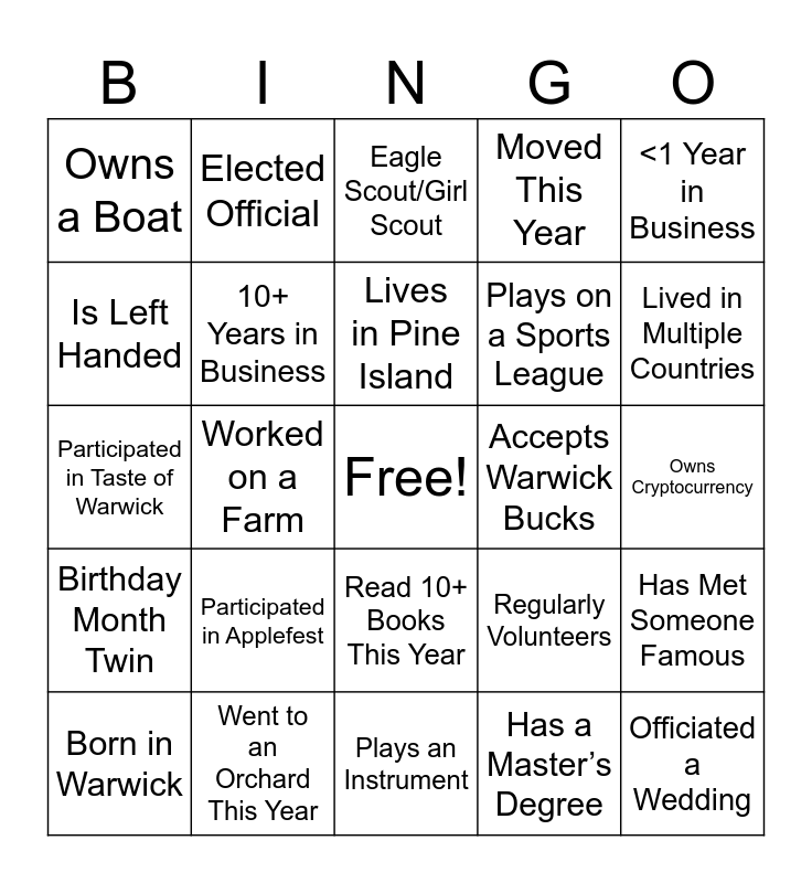 This bingo card has a free space and 34 words: Is a CPA, Has a Master’s Degree, Is Bilingual, Matching Color Shirt, Birthday Month Twin, 10+ Years in Business, <1 Year in Business, Born in Warwick, Elected Official, Bartender Background, Lives in Pine Island, Eagle Scout/Girl Scout, Mixer Newbie, Ran a Marathon, Accepts Warwick Bucks, Lived in Multiple Countries, Went to an Orchard This Year, Participated in Taste of Warwick, Participated in Applefest, Regularly Volunteers, Read 10+ Books This Year, Knows ASL, Owns a Boat, Owns Cryptocurrency, Plays an Instrument, Officiated a Wedding, Moved This Year, Is a Realtor, Plays on a Sports League, Is Left Handed, Has been on TV, Worked on a Farm, Has Met Someone Famous and Bought 2025 Gala Tickets.