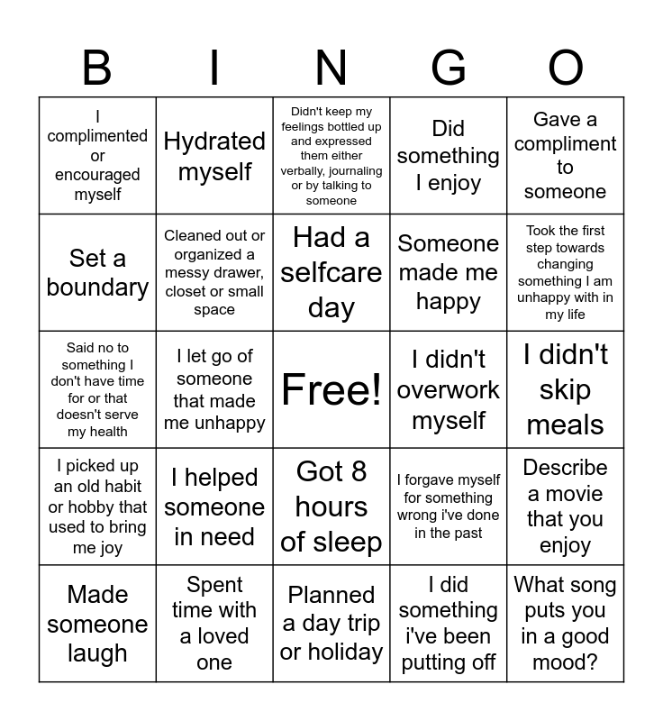 This bingo card has a free space and 24 words: I helped someone in need, Spent time with a loved one, Had a selfcare day, Made someone laugh, Gave a compliment to someone, I complimented or encouraged myself, Set a boundary, Hydrated myself, I didn't overwork myself, Got 8 hours of sleep, Someone made me happy, Said no to something I don't have time for or that doesn't serve my health, I forgave myself for something wrong i've done in the past, Describe a movie that you enjoy, Cleaned out or organized a messy drawer, closet or small space, I did something i've been putting off, I didn't skip meals, Didn't keep my feelings bottled up and expressed them either verbally, journaling or by talking to someone, Took the first step towards changing something I am unhappy with in my life, I let go of someone that made me unhappy, What song puts you in a good mood?, I picked up an old habit or hobby that used to bring me joy, Did something I enjoy and Planned a day trip or holiday.