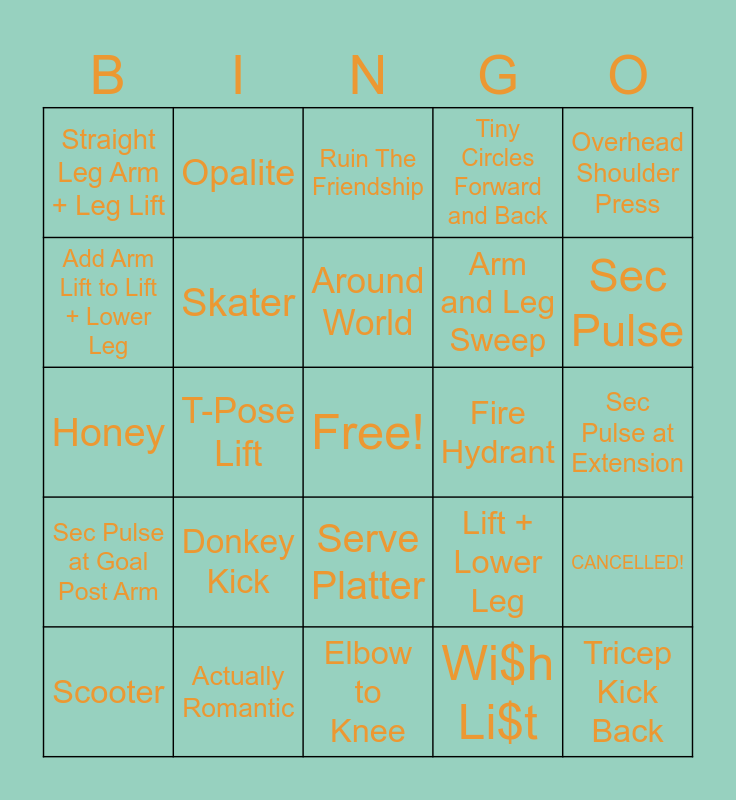 This bingo card has a free space and 39 words: Wide Squat, Wide Squat to Narrow, Push Heel into Ball, Skater, Scooter, Serve Platter, Around World, Overhead Shoulder Press, Overhead Shoulder Press, Sec Pulse at Goal Post Arm, T-Pose Lift, Tiny Circles Forward and Back, Tricep Kick Back, Sec Pulse at Extension, Fire Hydrant, Donkey Kick, Hamstring Curl, Straight Leg Arm + Leg Lift, Bird Dog, Lift + Lower Leg, Add Arm Lift to Lift + Lower Leg, Elbow to Knee, Arm and Leg Sweep, Sec Pulse, Regular Curl Up and Down, Curl with Oblique Twist, Hold Halfway, The Fate of Ophelia, Elizabeth Taylor, Opalite, Father Figure, Eldest Daughter, Ruin The Friendship, Actually Romantic, Wi$h Li$t, Wood, CANCELLED!, Honey and The Life of a Showgirl.