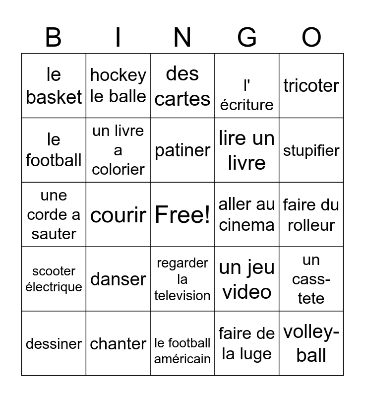 This bingo card has a free space and 24 words: danser, chanter, patiner, dessiner, tricoter, le basket, le football, hockey le balle, aller au cinema, regarder la television, lire un livre, une corde a sauter, un jeu video, un cass-tete, un livre a colorier, faire de la luge, faire du rolleur, des cartes, stupifier, courir, volley-ball, scooter électrique, l' écriture and le football américain.