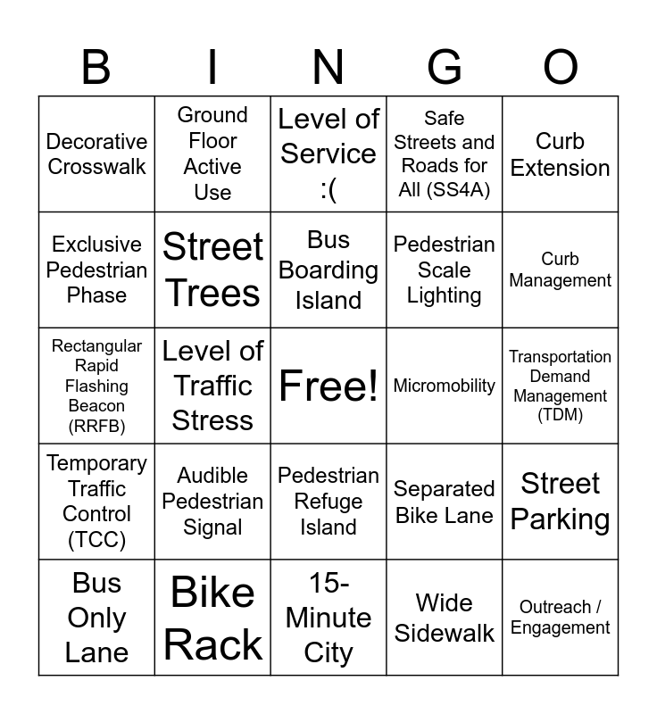 This bingo card has a free space and 24 words: Audible Pedestrian Signal, Bike Rack, Bus Boarding Island, Bus Only Lane, Curb Extension, Decorative Crosswalk, Exclusive Pedestrian Phase, Ground Floor Active Use, Micromobility, Pedestrian Refuge Island, Pedestrian Scale Lighting, Rectangular Rapid Flashing Beacon (RRFB), Separated Bike Lane, Street Parking, Street Trees, Wide Sidewalk, Transportation Demand Management (TDM), Level of Service :(, Curb Management, Level of Traffic Stress, Outreach / Engagement, Temporary Traffic Control (TCC), Safe Streets and Roads for All (SS4A) and 15-Minute City.