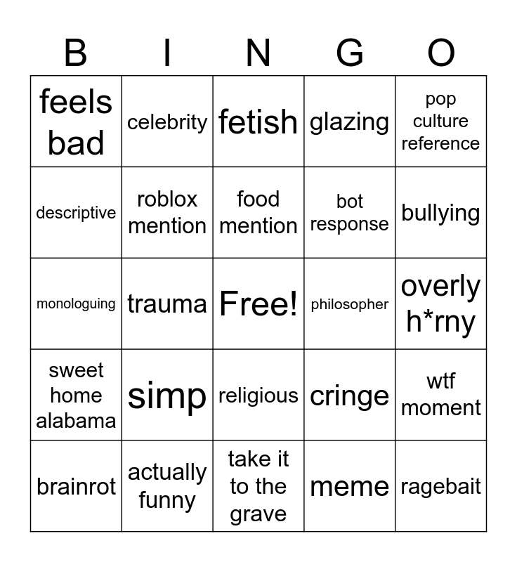 This bingo card has a free space and 24 words: simp, actually funny, food mention, brainrot, pop culture reference, feels bad, descriptive, celebrity, philosopher, religious, bot response, monologuing, cringe, wtf moment, roblox mention, meme, overly h*rny, fetish, bullying, trauma, ragebait, sweet home alabama, glazing and take it to the grave.