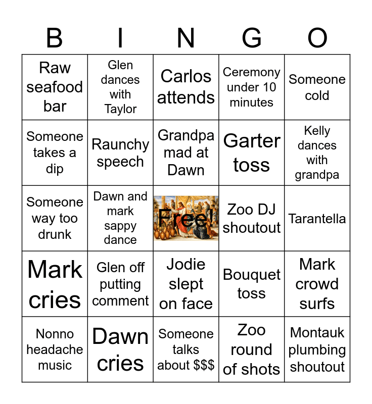 This bingo card has a free space and 24 words: Glen off putting comment, Dawn cries, Grandpa mad at Dawn, Nonno headache music, Someone cold, Raw seafood bar, Someone takes a dip, Glen dances with Taylor, Zoo DJ shoutout, Jodie slept on face, Garter toss, Someone way too drunk, Bouquet toss, Mark crowd surfs, Raunchy speech, Zoo round of shots, Tarantella, Carlos attends, Kelly dances with grandpa, Dawn and mark sappy dance, Montauk plumbing shoutout, Mark cries, Ceremony under 10 minutes and Someone talks about $$$.