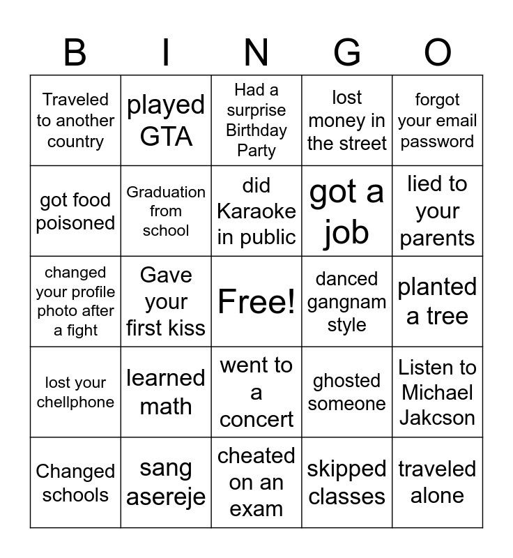 This bingo card has a free space and 29 words: Changed schools, Met a friend on vacation, Gave your first kiss, Adopted a pet, Traveled to another country, Had a surprise Birthday Party, Graduation from school, learned math, danced gangnam style, sang asereje, planted a tree, traveled alone, cheated on an exam, skipped classes, lied to your parents, got drunk, went to a concert, lost your chellphone, forgot your email password, changed your profile photo after a fight, ghosted someone, learned a second language, got a job, got food poisoned, lost money in the street, played GTA, Listen to Michael Jakcson, did Karaoke in public and practiced a sport.
