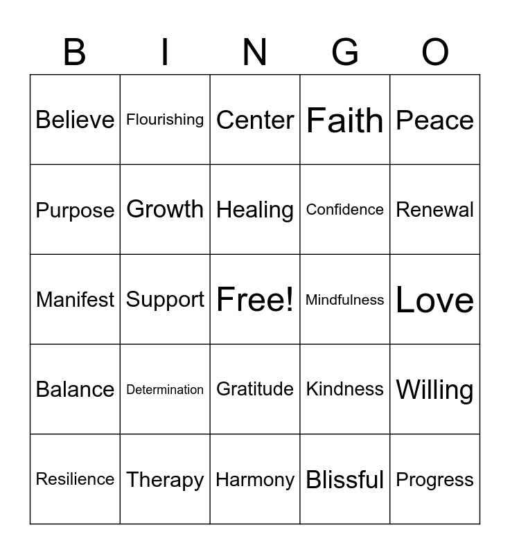 This bingo card has a free space and 39 words: Hope, Strength, Courage, Growth, Resilience, Gratitude, Healing, Joy, Peace, Balance, Support, Faith, Progress, Love, Mindfulness, Determination, Patience, Believe, Serenity, Kindness, Purpose, Harmony, Confidence, Renewal, Sober, Calm, Cool, Beautiful, Peaceful, Flourishing, Minds, Wellness, Center, Therapy, Blissful, Pride, Willing, Manifest and Cheer.