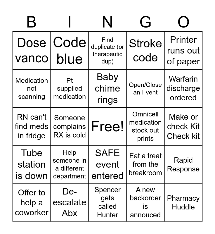 This bingo card has a free space and 40 words: Missing meds - Pt transferred, RN can't find meds in fridge, Temp trak goes off, Pt supplied medication, De-escalate Abx, SAFE event entered, Baby chime rings, Complete a med rec, Printer runs out of paper, Tube station is down, Someone complains RX is cold, Stroke code, Pharmacy Huddle, Make or check Kit Check kit, Omnicell medication stock out prints, Help someone in a different department, RN asks to have medication verified, Dose vanco, Log in to omnicell, Find duplicate (or therapeutic dup), Rapid Response, A new backorder is annouced, Open/Close an I-vent, Medication not scanning, Question about IV compatibility, Out of tubes, Thanked a coworker, Hear someone mispronounce medication, Was told "happy pharmacy week" from non-Rx staff, Change into hospital scrubs, Campus assessment paged, Offer to help a coworker, Cruser talks about a vacation, Eat a treat from the breakroom, Warfarin discharge ordered, Spencer gets called Hunter, Answers the pharmacy phone in under 2 rings, Attend patient rounds, Code blue and Find expired med.