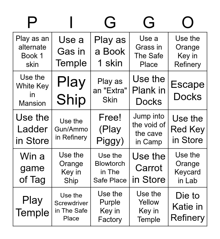This bingo card has a free space and 276 words: Play Alleys, Play Store, Play Refinery, Play The Safe Place, Play Sewers, Play Factory, Play Port, Play Ship, Play Docks, Play Temple, Play Camp, Play Lab, Play Breakout, Play Mansion, Die to the Piggy in Alleys, Die to the Piggy in Store, Die to Baren in Refinery, Die to the Piggy in The Safe Place, Die to the Piggy in Sewers, Die to Willow in Factory, Jump off the 3rd floor in Port, Die to Bobby in Ship, Die to the Piggy in Docks, Die to the swinging axe in Temple, Jump into the void of the cave in Camp, Die to an Infected Soldier in Camp, Die to Umbra in the Lab Vents, Die to Sentinel in Lab, Get Shot by Willow in Factory, Give Willow all the weapons in Lab, Give Tigry all the weapons in Lab, Play Distraction, Trip a Piggy trap, Get the same map twice in a row, Play Heist, Die to a Player Piggy, Die to Ombra in Breakout, Escape Alleys, Escape Store, Escape Refinery, Escape The Safe Place, Escape Sewers, Escape Factory, Escape Port, Escape Ship, Escape Docks, Escape Temple, Escape Camp, Escape Lab, Escape Breakout, Escape Mansion, Escape Heist, Die 3 times in a row, Trip a trap and live, Die in a Trap, Play a game with a Bot, Play a game with a Player Piggy, Play as Piggy, Play a game of Player + Bot, Play as Piggy with a Bot, Play a game of Swarm, Play a game of Infection, Play as Piggy for Infection, Play a game of Traitor, Play as the Traitor, Take out a Traitor, Play a game of Tag, Win a game of Tag, Play as a Book 1 skin, Play as an alternate Book 1 skin, Play as a Book 2 skin, Play as an alternate Book 2 skin, Play as an "Extra" Skin, Play as a "Community" Skin, As Piggy use a Tracking trap, Use Multiple survivor abilities at once, Use an expensive trap, Use an OP trap, Use a terrible trap, Kill someone in a trap, Die to an Infected Soldier in Outpost, Die to Felix in Refinery, Die to Kitty in Refinery, Die to Pandy in Refinery, Die to Katie in Refinery, Die to Filip in Refinery, Die to Kenneth in Ship, Die to Pepper in Ship, Escape Distraction, Give Willow 2 weapons in Lab, Give Tigry 2 weapons in Lab, Die to Piggy in Mansion, Die to Piggy in Heist, Kill everyone as Traitor, Use a Battery in Alleys, Use the Mop in Alleys, Use the Scissors in Alleys, Use the Screwdriver in Alleys, Use the Red Key in Alleys, Use the Orange Key in Alleys, Use the Yellow Key in Alleys, Use the Green Key in Alleys, Use the Blue Key in Alleys, Use the Purple Key in Alleys, Use the White Key in Alleys, Use a Battery in Store, Use a Grass in Store, Use the Carrot in Store, Use the Scissors in Store, Use the Remote Control in Store, Use the Ladder in Store, Use the Red Key in Store, Use the Orange Key in Store, Use the Yellow Key in Store, Use the Green Key in Store, Use the Blue Key in Store, Use the Purple Key in Store, Use the Battery in Refinery, Use the Carrot in Refinery, Use the Scissors in Refinery, Use the Screwdriver in Refinery, Use the Smoke Grenade in Refinery, Use the Gun/Ammo in Refinery, Use the Green Keycard in Refinery, Use the Red Key in Refinery, Use the Orange Key in Refinery, Use the Yellow Key in Refinery, Use the Green Key in Refinery, Use the Blue Key in Refinery, Use the Purple Key in Refinery, Use the White Key in Refinery, Use a Grass in The Safe Place, Use the Blowtorch in The Safe Place, Use the Fire Extinguisher in The Safe Place, Use the Screwdriver in The Safe Place, Use the Hammer in The Safe Place, Use the Ladder in The Safe Place, Use the Elevator Key in The Safe Place, Use the Red Key in The Safe Place, Use the Orange Key in The Safe Place, Use the Yellow Key in The Safe Place, Use the Green Key in The Safe Place, Use the Blue Key in The Safe Place, Use the Purple Key in The Safe Place, Use the White Key in The Safe Place, Use a Grass in Sewers, Use a White Gear in Sewers, Use the Mop in Sewers, Use the Plank in Sewers, Use the Screwdriver in Sewers, Use the Red Key in Sewers, Use the Orange Key in Sewers, Use the Yellow Key in Sewers, Use the Green Key in Sewers, Use the Blue Key in Sewers, Use the Purple Key in Sewers, Use the White Key in Sewers, Use a Wooden Sword in Factory, Use the Axe in Factory, Use the Fire Extinguisher in Factory, Use the Shovel in Factory, Use the Ladder in Factory, Use the Screwdriver in Factory, Use the Red Key in Factory, Use the Orange Key in Factory, Use the Yellow Key in Factory, Use the Green Key in Factory, Use the Blue Key in Factory, Use the Purple Key in Factory, Use a Battery in Port, Use the Gun/Ammo in Port, Use the Shovel in Port, Use the Plank in Port, Use the Grappling Hook in Port, Use the Red Key in Port, Use the Orange Key in Port, Use the Yellow Key in Port, Use the Green Key in Port, Use the Blue Key in Port, Use the Purple Key in Port, Use the Gun/Ammo in Ship, Use the Wrench in Ship, Use the Screwdriver in Ship, Use the Red Key in Ship, Use the Orange Key in Ship, Use the Yellow Key in Ship, Use the Green Key in Ship, Use the Blue Key in Ship, Use the Purple Key in Ship, Use the White Key in Ship, Use the Gun/Ammo in Docks, Use the TNT in Docks, Use the Candle in Docks, Use the Plank in Docks, Use the Hammer in Docks, Use the Red Key in Docks, Use the Orange Key in Docks, Use the Yellow Key in Docks, Use the Green Key in Docks, Use the Blue Key in Docks, Use the Purple Key in Docks, Use the White Key in Docks, Use a Gas in Temple, Use the Hammer in Temple, Use the Shovel in Temple, Use the Plank in Temple, Use the Candle in Temple, Use the Red Key in Temple, Use the Orange Key in Temple, Use the Yellow Key in Temple, Use the Green Key in Temple, Use the Blue Key in Temple, Use the Purple Key in Temple, Use the White Key in Temple, Use the TNT in Camp, Use the Shovel in Camp, Use the Rope in Camp, Use the Ladder in Camp, Use the Red Key in Camp, Use the Orange Key in Camp, Use the Yellow Key in Camp, Use the Green Key in Camp, Use the Blue Key in Camp, Use the Purple Key in Camp, Use the Elevator Key in Camp, Use the Wrench in Lab, Use the Dynamite in Lab, Use the Mop in