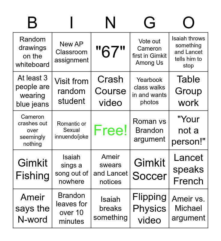 This bingo card has a free space and 44 words: Cameron Chung asks a crazy hypothetical, Ameir vs. Michael argument, Isaiah humps something, Ameir says the N-word, New AP Classroom video, Flipping Physics video, "67", Ameir vs. Caleb argument, Isaiah throws something and Lancet tells him to stop, Brandon leaves for over 10 minutes, Vote out Cameron first in Gimkit Among Us, Roman vs Brandon argument, Ameir swears and Lancet notices, Isaiah sings a song out of nowhere, The speaker stops working, Isaiah breaks something, Vote out Ameir first in Gimkit Among Us, Cameron crashes out over seemingly nothing, At least 4 people asleep, Table Group work, New AP Classroom assignment, We play Scorched Earth, Ameir crashout, Random drawings on the whiteboard, Lancet discovers a new brainrot, "Your not a person!", Lancet laughs, "Can you please not", Gimkit Soccer, Gimkit Fishing, Someone was in Radian mode, Lancet speaks French, Lancet speaks Spanish, "Ja", Romantic or Sexual innuendo/joke, Chambers walks in, Antonucci walks in, Watch a random video that has nothing to do with Physics, Crash Course video, At least 3 people are wearing blue jeans, Yearbook class walks in and wants photos, "Massive", Visit from random student and Someone moves or switches their seat.