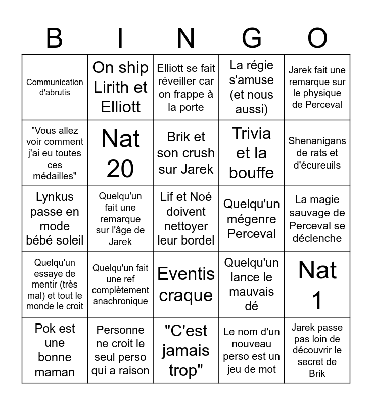 This bingo card has 25 words: Quelqu'un fait une ref complètement anachronique, "C'est jamais trop", Brik et son crush sur Jarek, Pok est une bonne maman, Jarek fait une remarque sur le physique de Perceval, Communication d'abrutis, "Vous allez voir comment j'ai eu toutes ces médailles", On ship Lirith et Elliott, Quelqu'un mégenre Perceval, Eventis craque, Trivia et la bouffe, Lynkus passe en mode bébé soleil, Quelqu'un lance le mauvais dé, Nat 1, Nat 20, Jarek passe pas loin de découvrir le secret de Brik, La magie sauvage de Perceval se déclenche, Elliott se fait réveiller car on frappe à la porte, Shenanigans de rats et d'écureuils, Quelqu'un fait une remarque sur l'âge de Jarek, Lif et Noé doivent nettoyer leur bordel, Personne ne croit le seul perso qui a raison, Quelqu'un essaye de mentir (très mal) et tout le monde le croit, La régie s'amuse (et nous aussi) and Le nom d'un nouveau perso est un jeu de mot.