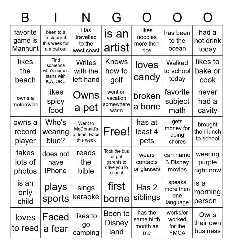 This bingo card has a free space and 48 words: Has 2 siblings, Walked to school today, Been to Disney land, Who's wearing blue?, Owns a pet, brought their lunch to school, been to a restaurant this week for a meal out, Faced a fear, has been to the ocean, Took the bus or got parents to drive you to school, had a hot drink today, is an artist, favorite subject math, broken a bone, is an only child, gets money for doing chores, likes the beach, likes to bake or cook, speaks more then one language, likes noodles more then rice, loves candy, Went to McDonald's at least twice this week, favorite game is Manhunt, Find someone who's names starts with K,A, OR J, is a morning person, Writes with the left hand, never had a cavity, loves to read, went on vacation somewhere warm, likes spicy food, works/or worked for the YMCA, has at least 4 pets, wearing purple right now, plays sports, owns a record player, wears contacts or glasses, can name 3 Disney movies, owns a motorcycle, reads the bible, sings karaoke, takes lots of photos, Owns their own business, Has travelled to the west coast, likes to go camping, Knows how to golf, first borne, does not have iPhone and has the same birth month as me.