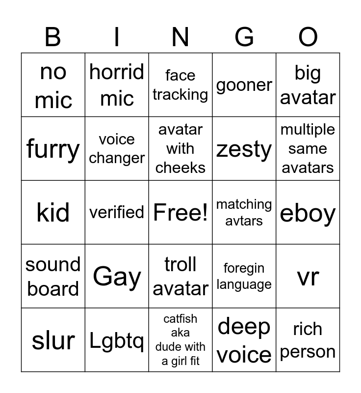 This bingo card has a free space and 24 words: Gay, Lgbtq, avatar with cheeks, slur, big avatar, no mic, furry, horrid mic, matching avtars, troll avatar, zesty, kid, foregin language, vr, voice changer, deep voice, eboy, face tracking, multiple same avatars, verified, rich person, sound board, gooner and catfish aka dude with a girl fit.