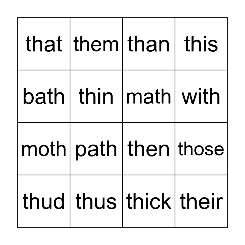 This bingo card has 16 words: thus, those, than, that, moth, them, then, thick, bath, thin, thud, this, path, with, math and their.