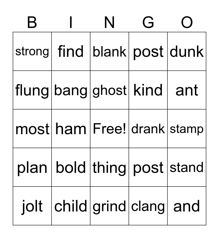 This bingo card has a free space and 24 words: bold, child, ghost, jolt, dunk, strong, flung, find, drank, thing, kind, most, post, stand, bang, clang, stamp, blank, ant, ham, and, plan, post and grind.