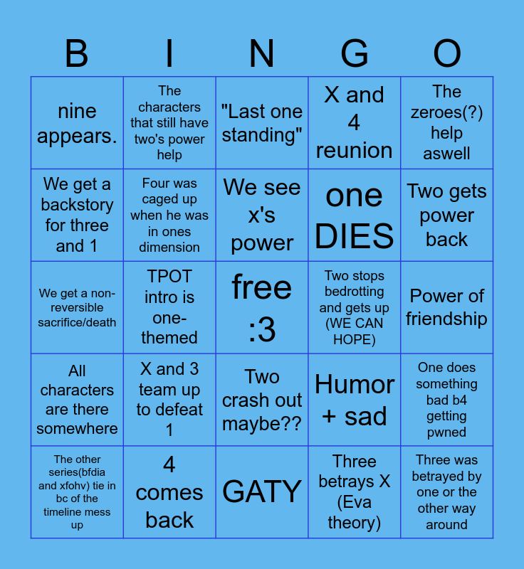 This bingo card has a free space and 24 words: X and 3 team up to defeat 1, 4 comes back, We see x's power, The other series(bfdia and xfohv) tie in bc of the timeline mess up, The zeroes(?) help aswell, nine appears., We get a backstory for three and 1, The characters that still have two's power help, Two stops bedrotting and gets up (WE CAN HOPE), Two crash out maybe??, one DIES, We get a non-reversible sacrifice/death, Humor + sad, One does something bad b4 getting pwned, Four was caged up when he was in ones dimension, Three betrays X (Eva theory), Power of friendship, "Last one standing", Two gets power back, TPOT intro is one-themed, Three was betrayed by one or the other way around, All characters are there somewhere, X and 4 reunion and GATY.