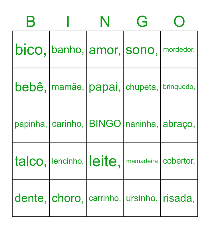 This bingo card has a free space and 27 words: mamadeira, fralda, chupeta,, carrinho,, bebê,, amor,, banho,, talco,, naninha,, cobertor,, papinha,, sono,, dente,, choro,, brinquedo,, sapatinho,, mamãe,, papai,, lencinho,, bico,, abraço,, ursinho,, carinho,, risada,, leite,, mordedor, and toalhinha.
