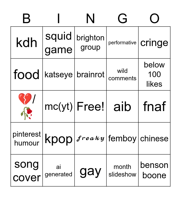 This bingo card has a free space and 24 words: kpop, ai generated, brainrot, song cover, cringe, kdh, food, squid game, aib, 𝓯𝓻𝓮𝓪𝓴𝔂, wild comments, 💔/🥀, femboy, chinese, katseye, month slideshow, fnaf, brighton group, below 100 likes, mc(yt), benson boone, pinterest humour, performative and gay.
