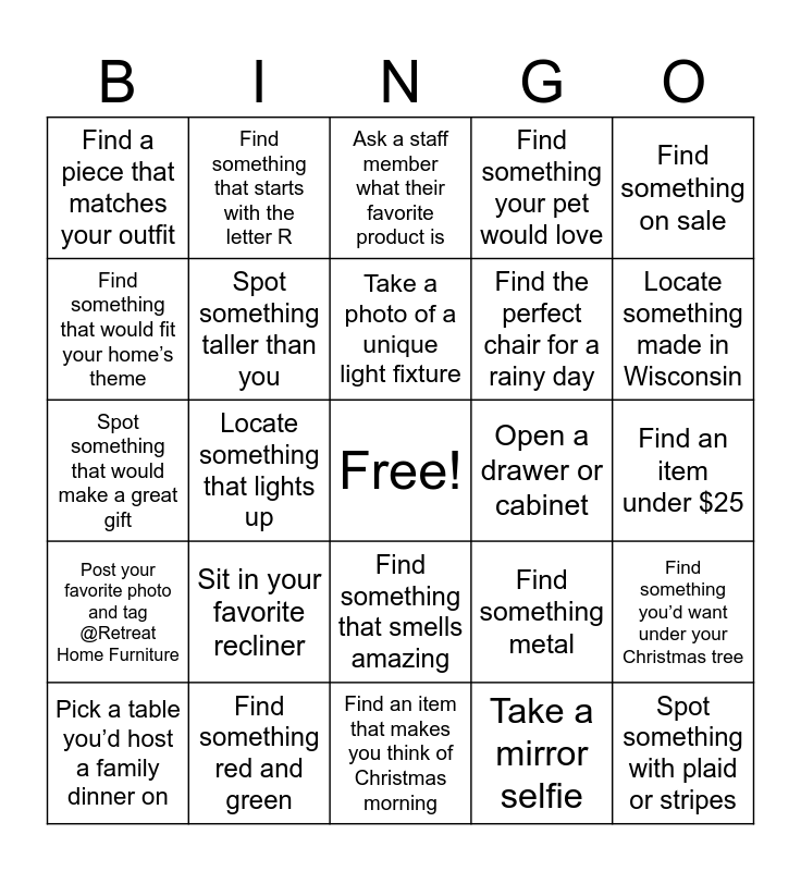 This bingo card has a free space and 24 words: Sit in your favorite recliner, Find something red and green, Take a photo of a unique light fixture, Pick a table you’d host a family dinner on, Find something on sale, Find a piece that matches your outfit, Find something that would fit your home’s theme, Find something that starts with the letter R, Open a drawer or cabinet, Find something that smells amazing, Find the perfect chair for a rainy day, Spot something that would make a great gift, Find something metal, Find something you’d want under your Christmas tree, Spot something taller than you, Take a mirror selfie, Find an item under $25, Ask a staff member what their favorite product is, Locate something made in Wisconsin, Locate something that lights up, Spot something with plaid or stripes, Post your favorite photo and tag @Retreat Home Furniture, Find something your pet would love and Find an item that makes you think of Christmas morning.