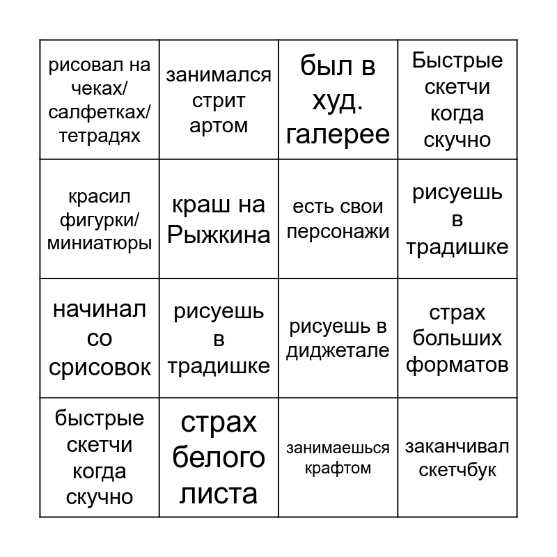 This bingo card has 19 words: рисуешь в диджетале, ходил в художку, был в худ. галерее, заканчивал скетчбук, страх больших форматов, красил фигурки/миниатюры, занимаешься крафтом, рисовал на чеках/салфетках/ тетрадях, занимался стрит артом, начинал со срисовок, рисуешь в традишке, краш на Рыжкина, есть свои персонажи, страх белого листа, быстрые скетчи когда скучно, пережил артблок, Быстрые скетчи когда скучно, рисуешь в традишке and страх больших форматов.