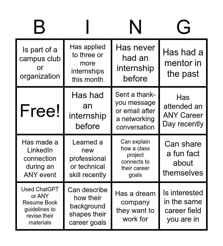 This bingo card has 16 words: Can describe how their background shapes their career goals, Can share a fun fact about themselves, Has never had an internship before, Is part of a campus club or organization, Has made a LinkedIn connection during an ANY event, Has applied to three or more internships this month, Can explain how a class project connects to their career goals, Has a dream company they want to work for, Free!, Has had an internship before, Used ChatGPT or ANY Resume Book guidelines to revise their materials, Has had a mentor in the past, Learned a new professional or technical skill recently, Has attended an ANY Career Day recently, Sent a thank-you message or email after a networking conversation and Is interested in the same career field you are in.