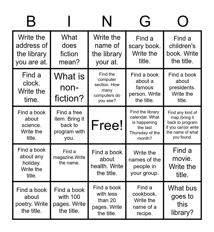 This bingo card has a free space and 24 words: Find a magazine.Write the name., Find a book with 100 pages. Write the title., Find the computer section. How many computers do you see?, Find a book about poetry. Write the title., Find a children's book. Write the title., Write the address of the library you are at., Find a clock. Write the time., What does fiction mean?, Find the library calendar. What is happening the last Thursday of the month?, Find a book about health. Write the title., Find a book about a famous person. Write the title., Find a book about science. Write the title., Write the names of the people in your group., Find a movie. Write the title., What is non-fiction?, Find a cookbook. Write the name of a recipe., Find any kind of map.(bring it back to program if you can)or write the name of what you found., Write the name of the library your at., Find a book about presidents. Write the title., Find a free item. Bring it back to program with you., What bus goes to this library?, Find a book about any holiday. Write the title., Find a scary book. Write the title. and Find a book with less than 20 pages. Write the title..