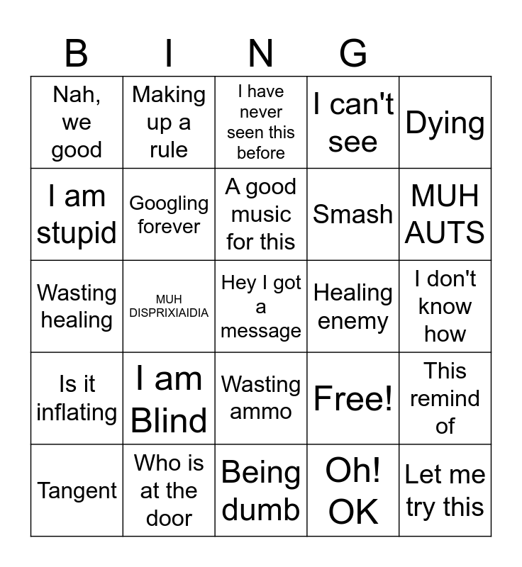 This bingo card has 25 words: I am Blind, Being dumb, A good music for this, Tangent, Dying, Nah, we good, I am stupid, Making up a rule, Healing enemy, Wasting ammo, Smash, Wasting healing, Free!, This remind of, Googling forever, Let me try this, I don't know how, I have never seen this before, MUH AUTS, MUH DISPRIXIAIDIA, Hey I got a message, Who is at the door, Is it inflating, I can't see and Oh! OK.