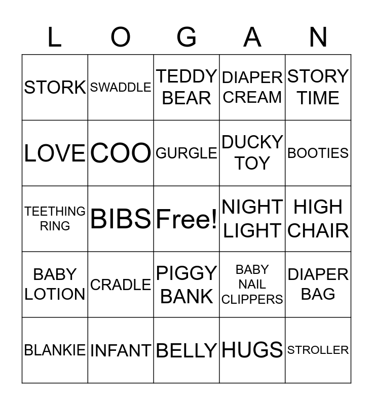 This bingo card has a free space and 24 words: CRADLE, INFANT, GURGLE, BLANKIE, STORY TIME, STORK, LOVE, SWADDLE, NIGHT LIGHT, PIGGY BANK, DUCKY TOY, TEETHING RING, BABY NAIL CLIPPERS, DIAPER BAG, COO, HUGS, HIGH CHAIR, TEDDY BEAR, BOOTIES, BIBS, STROLLER, BABY LOTION, DIAPER CREAM and BELLY.