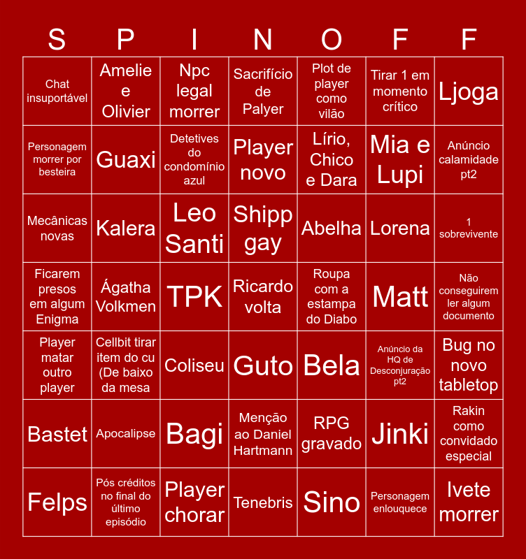 This bingo card has 49 words: Bastet, Kalera, Bagi, Guto, Abelha, Matt, Ljoga, Felps, Guaxi, TPK, Player novo, Plot de player como vilão, Mia e Lupi, 1 sobrevivente, Player matar outro player, Cellbit tirar item do cu (De baixo da mesa, Npc legal morrer, Shipp gay, Sino, Tirar 1 em momento crítico, Anúncio calamidade pt2, Personagem morrer por besteira, Amelie e Olivier, Detetives do condomínio azul, Tenebris, Lírio, Chico e Dara, Lorena, Rakin como convidado especial, Chat insuportável, Ágatha Volkmen, Player chorar, Menção ao Daniel Hartmann, Bela, Jinki, Não conseguirem ler algum documento, Ficarem presos em algum Enigma, Apocalipse, Coliseu, Ricardo volta, Roupa com a estampa do Diabo, Personagem enlouquece, Bug no novo tabletop, Mecânicas novas, Pós créditos no final do último episódio, Leo Santi, Sacrifício de Palyer, RPG gravado, Anúncio da HQ de Desconjuração pt2 and Ivete morrer.