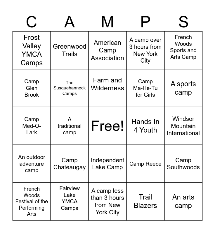 This bingo card has a free space and 24 words: Camp Chateaugay, Fairview Lake YMCA Camps, Farm and Wilderness, French Woods Festival of the Performing Arts, French Woods Sports and Arts Camp, Frost Valley YMCA Camps, Camp Glen Brook, Greenwood Trails, Hands In 4 Youth, Independent Lake Camp, Camp Ma-He-Tu for Girls, Camp Med-O-Lark, Camp Reece, Camp Southwoods, The Susquehannock Camps, Trail Blazers, Windsor Mountain International, American Camp Association, A sports camp, A traditional camp, An arts camp, An outdoor adventure camp, A camp over 3 hours from New York City and A camp less than 3 hours from New York City.
