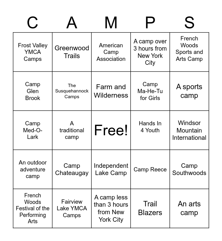 This bingo card has a free space and 24 words: Camp Chateaugay, Fairview Lake YMCA Camps, Farm and Wilderness, French Woods Festival of the Performing Arts, French Woods Sports and Arts Camp, Frost Valley YMCA Camps, Camp Glen Brook, Greenwood Trails, Hands In 4 Youth, Independent Lake Camp, Camp Ma-He-Tu for Girls, Camp Med-O-Lark, Camp Reece, Camp Southwoods, The Susquehannock Camps, Trail Blazers, Windsor Mountain International, American Camp Association, A sports camp, A traditional camp, An arts camp, An outdoor adventure camp, A camp over 3 hours from New York City and A camp less than 3 hours from New York City.