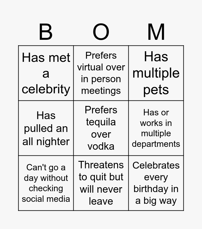 This bingo card has a free space and 8 words: Has or works in multiple departments, Has multiple pets, Prefers virtual over in person meetings, Can't go a day without checking social media, Has met a celebrity, Celebrates every birthday in a big way, Has pulled an all nighter and Threatens to quit but will never leave.