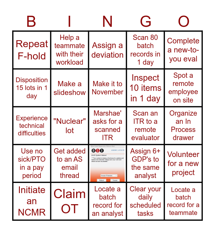 This bingo card has 1 images, a free space and 28 words: Initiate an NCMR, Teammate O/O/O; Complete their task, "Nuclear" lot, Same-day release/ eval/QMI, Repeat F-hold, Assign a deviation, Make a slideshow, Get added to an AS email thread, Scan an ITR to a remote evaluator, Claim OT, Organize an In Process drawer, Locate a batch record for a teammate, Locate a batch record for an analyst, Clear your daily scheduled tasks, Spot a remote employee on site, Train another employee, Use no sick/PTO in a pay period, Complete a new-to-you eval, Experience technical difficulties, Assign 6+ GDP's to the same analyst, Finish 7 evals in 1 day, Inspect 10 items in 1 day, Disposition 15 lots in 1 day, Scan 80 batch records in 1 day, Help a teammate with their workload, Volunteer for a new project, Make it to November and Make it to December.