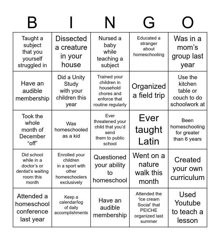 This bingo card has 55 words: Read aloud daily to your children, Attended a homeschool conference last year, Taken a JBYC (Just Because You Can) this month, Taught a subject that you yourself struggled in, Have an audible membership, Follow at least 2 Homeschool accounts on social media, Did a Unity Study with your children this year, Own a laminator, Organized a field trip, Used Baking as a Science or Math opportunity, Educated a stranger about homeschooling, Heated your coffee/tea up at least 3 times in one day this week, Created a rhyme, song, or mnemonic to help teach your children something, Sought help from family members to teach a subject, Went to the library this week, Got together with homeschool friends this week, Was in a mom’s group last year, Was homeschooled as a kid, Encouraged a fellow home- schooling parent this week, Ever threatened your child that you’d send them to public school, Ever taught Latin, Has started or been in a book club, Went on a nature walk this month, Nursed a baby while teaching a subject, Are in a coop, Trained your children in household chores and enforce that routine regularly, Attended the ‘Ice cream Social’ that PEICHE organized last summer, Completely given up a curriculum that didn’t work, part way through the year, Been homeschooling for greater than 6 years, Created your own curriculum, Homeschooled through a public school’s PD Day or Storm Day, Have enjoyed a Poetry Tea Time with your kids, Have Googled answers while on a walk, Enjoyed a public school’s playground during school hours, Have an audible membership, Took the whole month of December “off”, Used raisins or Cheerios to teach a math concept, Did school while in a doctor’s or dentist’s waiting room this month, Used Youtube to teach a lesson, Not finished the workbook before calling it Summer Break, (with no intention of finishing it later), Dissected a creature in your house, Promised you’d school through the Summer (and then didn’t), Promised you’d school through the summer, and did!, Participated in a Co-op, Enrolled your children in a sport with other homeschoolers exclusively, Keep a calendar/log of daily accomplishments, Felt insecure or envious when you hear about what another homeschool family is doing, Cried tears of joy over what a gift homeschooling has been for your family, Have a school desk specifically for your children to work at while they school, Use the kitchen table or couch to do schoolwork at, Had your children copy passages from a living book as part of penmanship practice, Been inspired by another homeschool family to emulate something similar to what they're doing, Cried in frustration because your child wasn't 'getting it', Questioned your ability to homeschool and Went to bed feeling satisfied and at peace with your homeschool journey.
