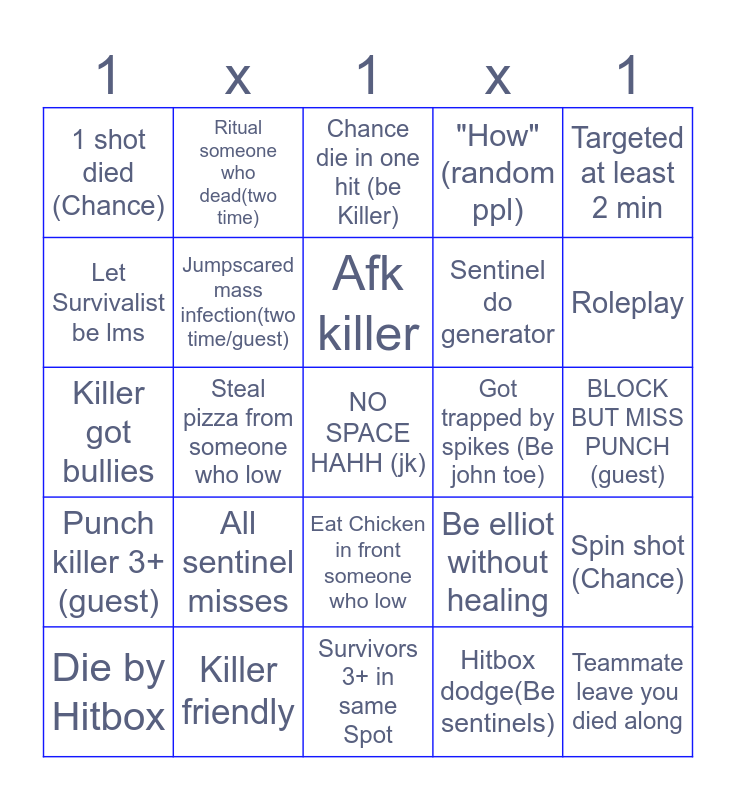 This bingo card has a free space and 24 words: All sentinel misses, Killer friendly, Afk killer, Die by Hitbox, Targeted at least 2 min, 1 shot died (Chance), Let Survivalist be lms, Ritual someone who dead(two time), Got trapped by spikes (Be john toe), Eat Chicken in front someone who low, Sentinel do generator, Killer got bullies, Be elliot without healing, Spin shot (Chance), Jumpscared mass infection(two time/guest), Hitbox dodge(Be sentinels), BLOCK BUT MISS PUNCH (guest), Chance die in one hit (be Killer), Roleplay, Steal pizza from someone who low, Teammate leave you died along, Punch killer 3+ (guest), "How" (random ppl) and Survivors 3+ in same Spot.