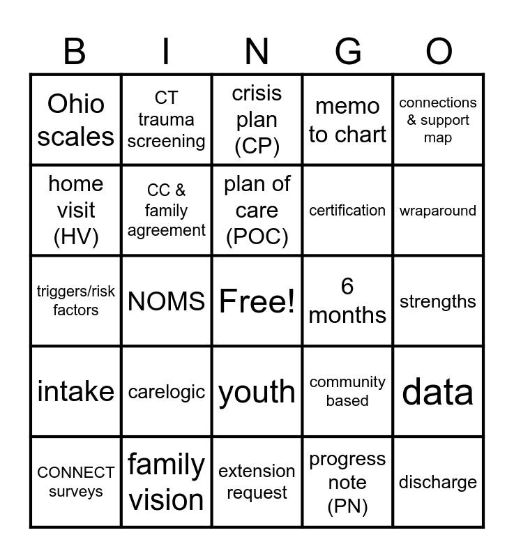 This bingo card has a free space and 34 words: call log, progress note (PN), comprehensive assessment (CA), release of information (ROI), intake, CC & family agreement, connections & support map, CONNECT surveys, CT trauma screening, PIE, plan of care (POC), crisis plan (CP), child & family team (CFT), strategies, 6 months, wraparound, family vision, triggers/risk factors, carelogic, community based, youth, families, Ohio scales, strengths, extension request, discharge, memo to chart, verification of services (VOS), certification, home visit (HV), observation, NOMS, data and performance outcome measures (POMS).