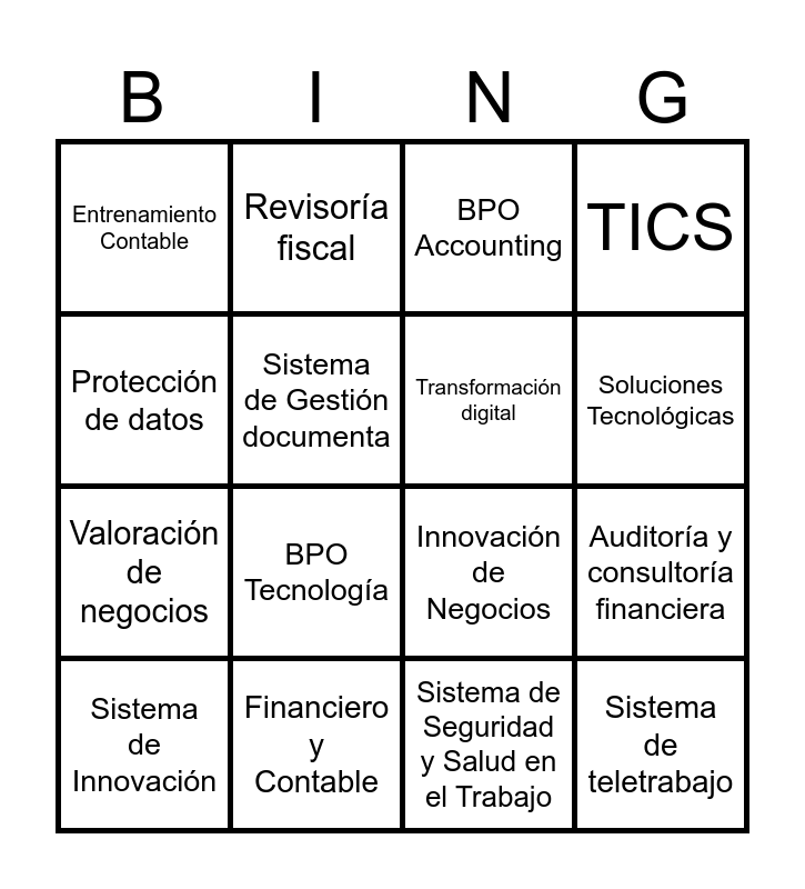 This bingo card has 16 words: Financiero y Contable, Auditoría y consultoría financiera, BPO Accounting, Entrenamiento Contable, Valoración de negocios, Revisoría fiscal, Innovación de Negocios, Sistema de Seguridad y Salud en el Trabajo, Protección de datos, Sistema de Gestión documenta, Sistema de Innovación, TICS, BPO Tecnología, Soluciones Tecnológicas, Transformación digital and Sistema de teletrabajo.
