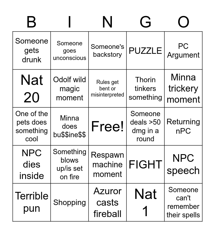 This bingo card has a free space and 25 words: Something blows up/is set on fire, Azuror casts fireball, Rules get bent or misinterpreted, Terrible pun, PC Argument, Someone gets drunk, Nat 20, Someone goes unconscious, Someone deals >50 dmg in a round, Respawn machine moment, Thorin tinkers something, One of the pets does something cool, FIGHT, NPC speech, Odolf wild magic moment, Something breaks for Aux, Returning nPC, Someone's backstory, Minna trickery moment, Minna does bu$$ine$$, Someone can't remember their spells, Shopping, NPC dies inside, PUZZLE and Nat 1.