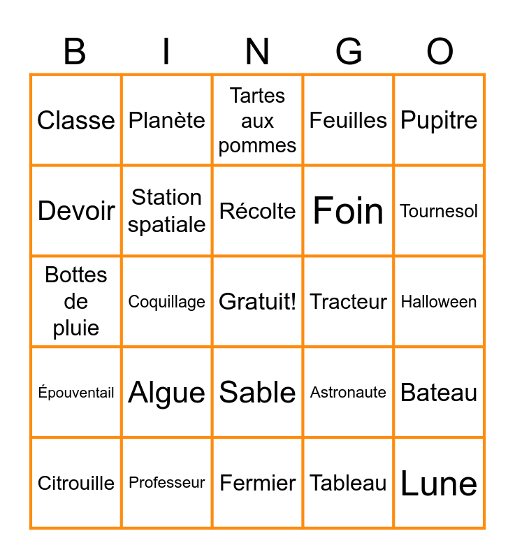 This bingo card has a free space and 29 words: Citrouille, Fusée, Coquillage, Grange, Classe, Tartes aux pommes, Station spatiale, Algue, Tracteur, Professeur, Halloween, Lune, Fermier, Tableau, Tournesol, Extra terreste, Sable, Épouventail, Pupitre, Bottes de pluie, Astronaute, Poisson, Foin, Devoir, Feuilles, Planète, Bateau, Récolte and Cours d'école.