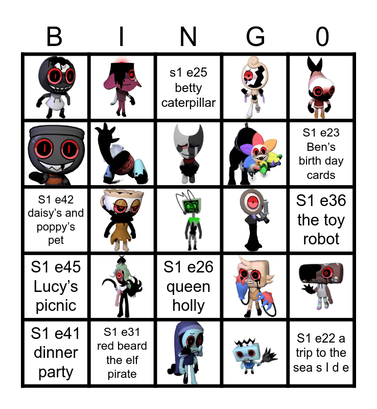 This bingo card has 24 images and 26 words: S1 e21 Gaston’s visit, S1 e22 a trip to the sea s I d e, S1 e23 Ben’s birth day cards, S1 e24 book, s1 e25 betty caterpillar, S1 e26 queen holly, S1 e27 the teeth fairy, S1 e28 the elf’s wind mill, S1 e29 the elf’s band, S1 e30 the ants hill, S1 e31 red beard the elf pirate, S1 e32 tadpoles, S1 e33 cows, S1 e34 queen thistles day off, S1 e35 nature class, S1 e36 the toy robot, S1 e37 BIG bad barry, S1 e38 king thistle’s birthday, S1 e40 the wand factory, S1 e39 camping out, S1 e41 dinner party, S1 e42 daisy’s and poppy’s pet, S1 e43 the elf rocket, S1 e44 picnic on the moon, S1 e45 Lucy’s picnic and S1 e46 acorn day.