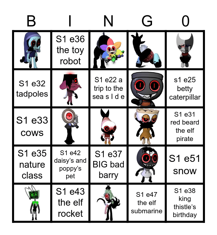 This bingo card has 24 images and 32 words: S1 e21 Gaston’s visit, S1 e22 a trip to the sea s I d e, S1 e23 Ben’s birth day cards, S1 e24 book, s1 e25 betty caterpillar, S1 e26 queen holly, S1 e27 the teeth fairy, S1 e28 the elf’s wind mill, S1 e29 the elf’s band, S1 e30 the ants hill, S1 e31 red beard the elf pirate, S1 e32 tadpoles, S1 e33 cows, S1 e34 queen thistles day off, S1 e35 nature class, S1 e36 the toy robot, S1 e37 BIG bad barry, S1 e38 king thistle’s birthday, S1 e40 the wand factory, S1 e39 camping out, S1 e41 dinner party, S1 e42 daisy’s and poppy’s pet, S1 e43 the elf rocket, S1 e44 picnic on the moon, S1 e45 Lucy’s picnic, S1 e46 acorn day, S1 e47 the elf submarine, S1 e48 a visit ping to the marigolds, S1 e49 woodpecker, S1 e50 the party, S1 e51 snow and S1 e52 the North Pole.