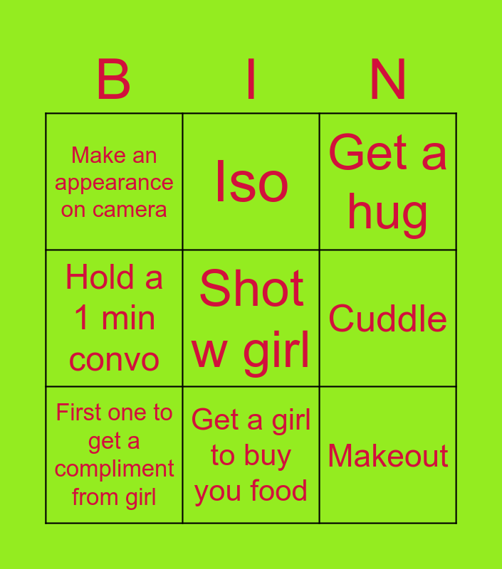 This bingo card has 9 words: First one to get a compliment from girl, Get a hug, Iso, Hold a 1 min convo, Make an appearance on camera, Cuddle, Shot w girl, Makeout and Get a girl to buy you food.