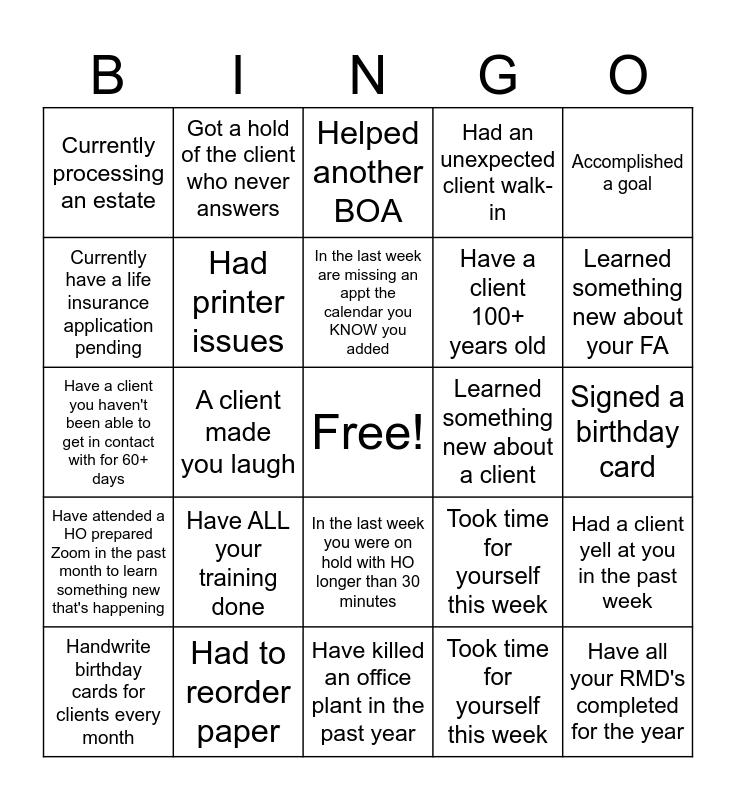 This bingo card has a free space and 24 words: Handwrite birthday cards for clients every month, Have ALL your training done, In the last week are missing an appt the calendar you KNOW you added, Took time for yourself this week, Accomplished a goal, Currently processing an estate, Got a hold of the client who never answers, Helped another BOA, Learned something new about a client, Signed a birthday card, Have a client you haven't been able to get in contact with for 60+ days, Had printer issues, Took time for yourself this week, Had a client yell at you in the past week, Currently have a life insurance application pending, Had to reorder paper, Have killed an office plant in the past year, Had an unexpected client walk-in, Learned something new about your FA, Have attended a HO prepared Zoom in the past month to learn something new that's happening, A client made you laugh, In the last week you were on hold with HO longer than 30 minutes, Have a client 100+ years old and Have all your RMD's completed for the year.