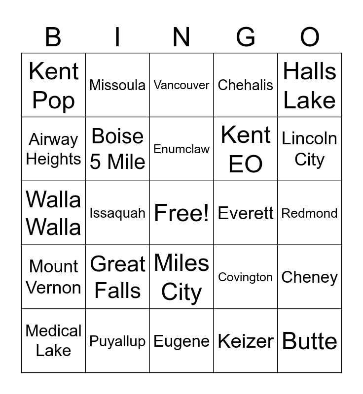 This bingo card has a free space and 46 words: Billings, Butte, Clarkston, Eugene, Great Falls, Helena, Missoula, Oregon City, Airway Heights, Boise Vista, Boise 5 Mile, Chehalis, Cheney, Covington, Deer Park, Depoe Bay, Enumclaw, Everett, Federal Way, Halls Lake, Issaquah, Keizer, Kent Pop, Kent EO, Kettle Falls, Lincoln City, Medical Lake, Meridian, Miles City, Mount Vernon, Nampa, Olympia, Ontario, Pacific City, Pacific, Puyallup, Redmond, Spanaway, Spokane Valley, Tillamook, Twin Falls, Vancouver, Walla Walla, Bothell, Hillsboro and Kennewick.