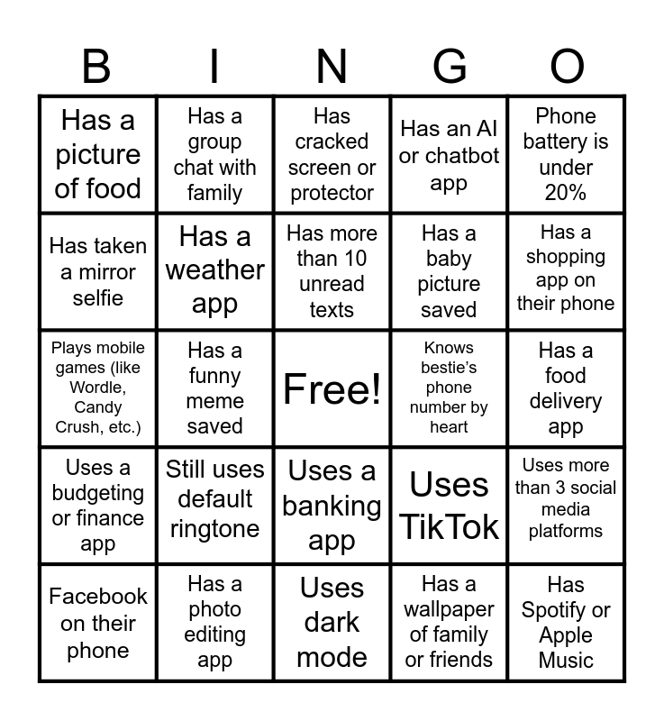 This bingo card has a free space and 24 words: Still uses default ringtone, Has a photo editing app, Has more than 10 unread texts, Facebook on their phone, Phone battery is under 20%, Has a picture of food, Has taken a mirror selfie, Has a group chat with family, Knows bestie’s phone number by heart, Uses a banking app, Has a baby picture saved, Plays mobile games (like Wordle, Candy Crush, etc.), Uses TikTok, Uses more than 3 social media platforms, Has a weather app, Has a wallpaper of family or friends, Has a food delivery app, Has cracked screen or protector, Has a shopping app on their phone, Has a funny meme saved, Has Spotify or Apple Music, Uses a budgeting or finance app, Has an AI or chatbot app and Uses dark mode.