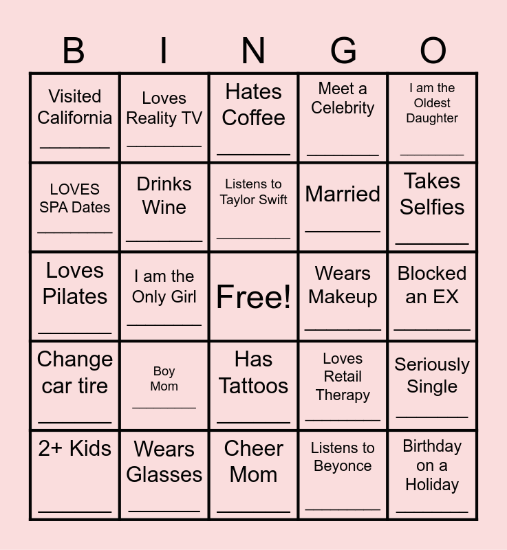 This bingo card has a free space and 24 words: Boy Mom _________, Wears Glasses ______, Listens to Taylor Swift __________, 2+ Kids ______, I am the Oldest Daughter _________, Visited California _______, LOVES SPA Dates _________, Loves Reality TV ________, Wears Makeup _______, Has Tattoos ______, Married ______, Loves Pilates ______, Loves Retail Therapy _________, Seriously Single _______, Drinks Wine _______, Listens to Beyonce _________, Blocked an EX _______, Hates Coffee ______, Takes Selfies ______, I am the Only Girl ________, Birthday on a Holiday ________, Change car tire ______, Meet a Celebrity ________ and Cheer Mom ______.