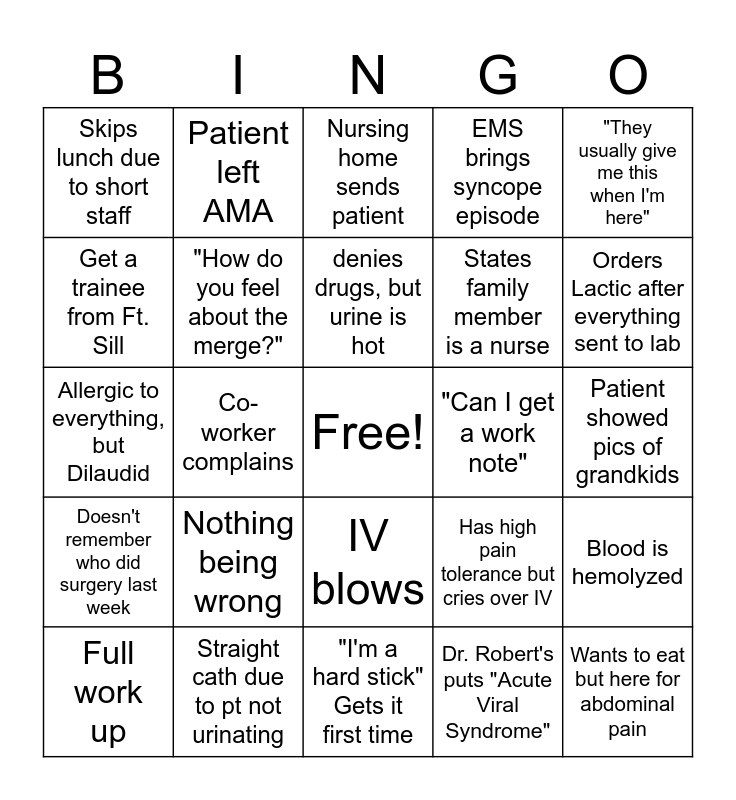 This bingo card has a free space and 24 words: Nothing being wrong, Straight cath due to pt not urinating, denies drugs, but urine is hot, Full work up, "They usually give me this when I'm here", Skips lunch due to short staff, Get a trainee from Ft. Sill, Patient left AMA, "Can I get a work note", IV blows, States family member is a nurse, Allergic to everything, but Dilaudid, Has high pain tolerance but cries over IV, Blood is hemolyzed, "How do you feel about the merge?", Dr. Robert's puts "Acute Viral Syndrome", Patient showed pics of grandkids, Nursing home sends patient, Orders Lactic after everything sent to lab, Co-worker complains, Wants to eat but here for abdominal pain, Doesn't remember who did surgery last week, EMS brings syncope episode and "I'm a hard stick" Gets it first time.