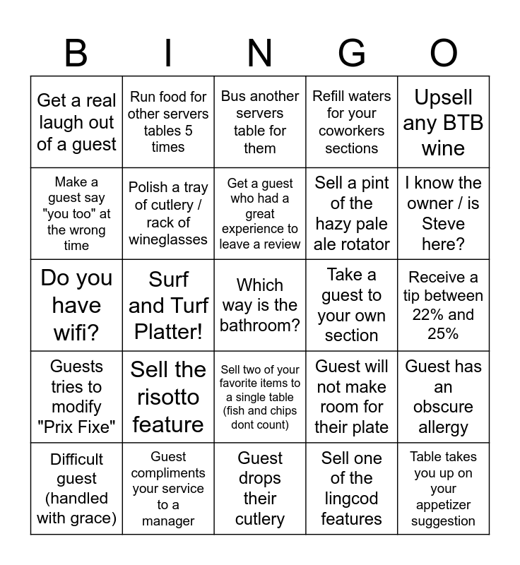 This bingo card has a free space and 24 words: Sell the risotto feature, Guest compliments your service to a manager, Get a guest who had a great experience to leave a review, Difficult guest (handled with grace), Upsell any BTB wine, Get a real laugh out of a guest, Make a guest say "you too" at the wrong time, Run food for other servers tables 5 times, Take a guest to your own section, Sell two of your favorite items to a single table (fish and chips dont count), Sell a pint of the hazy pale ale rotator, Do you have wifi?, Guest will not make room for their plate, Guest has an obscure allergy, Polish a tray of cutlery / rack of wineglasses, Sell one of the lingcod features, Receive a tip between 22% and 25%, Bus another servers table for them, I know the owner / is Steve here?, Surf and Turf Platter!, Table takes you up on your appetizer suggestion, Guests tries to modify "Prix Fixe", Refill waters for your coworkers sections and Guest drops their cutlery.